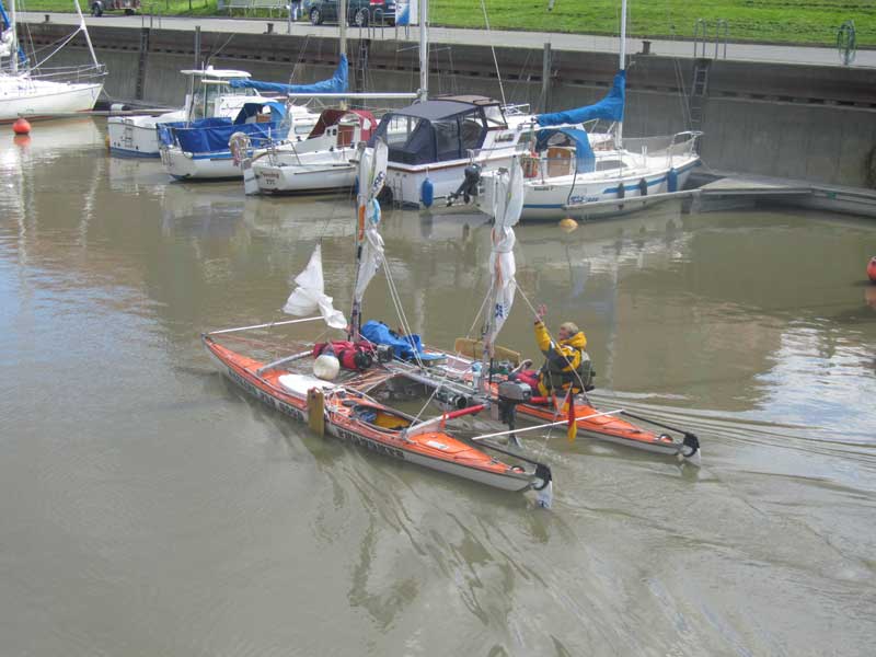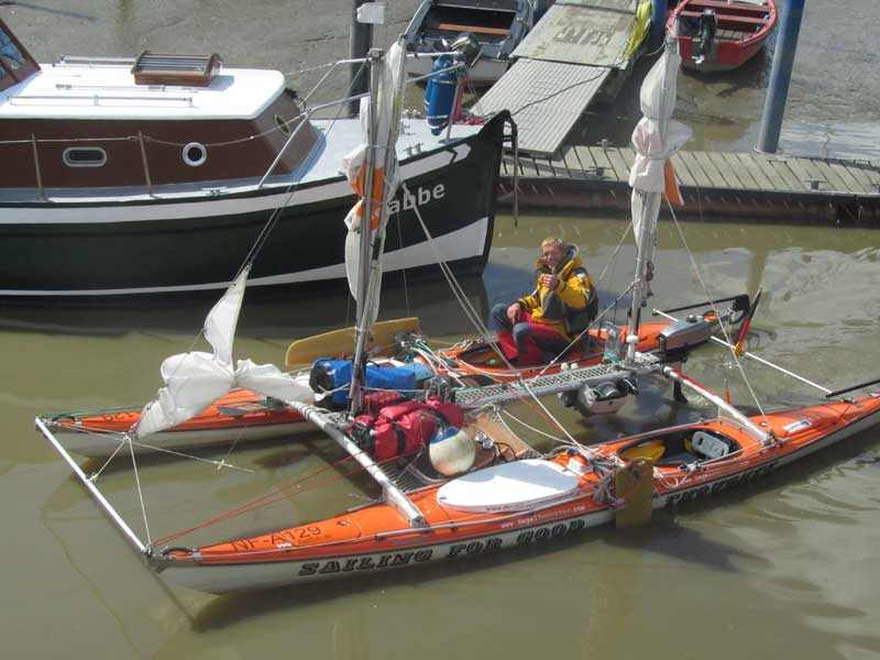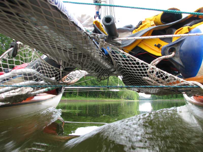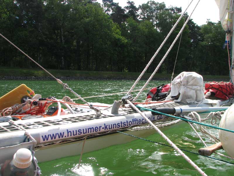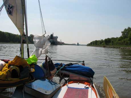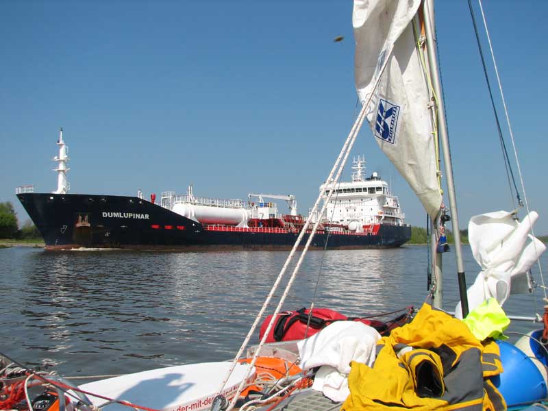 It was hard for all of us this time. We cried at the bridge and had weird feelings. Nevertheless, my 3.3 hp strong turbine finally took off on this Tuesday at 12 pm. Sabrina and Tina are taking the last pictures, while we are taking off and suddenly we're on the way. I'm tired by all the preparation we had to do during the last weeks, so I don't even start worrying about anything. The first destination is to go away from everybody who is waving goodbye, then towards the Kiel Canal on the Eider River. Though I really had wished for a better start across the North-Sea to Cuxhaven - in a sailing and navigation way. It's the strong east wind that is too mighty. Once the sails are on top for the first time, there's silence around me. No look, no talks. The first few days are very strange. I really don't know where I am in my inner. I'm in a good mood, |